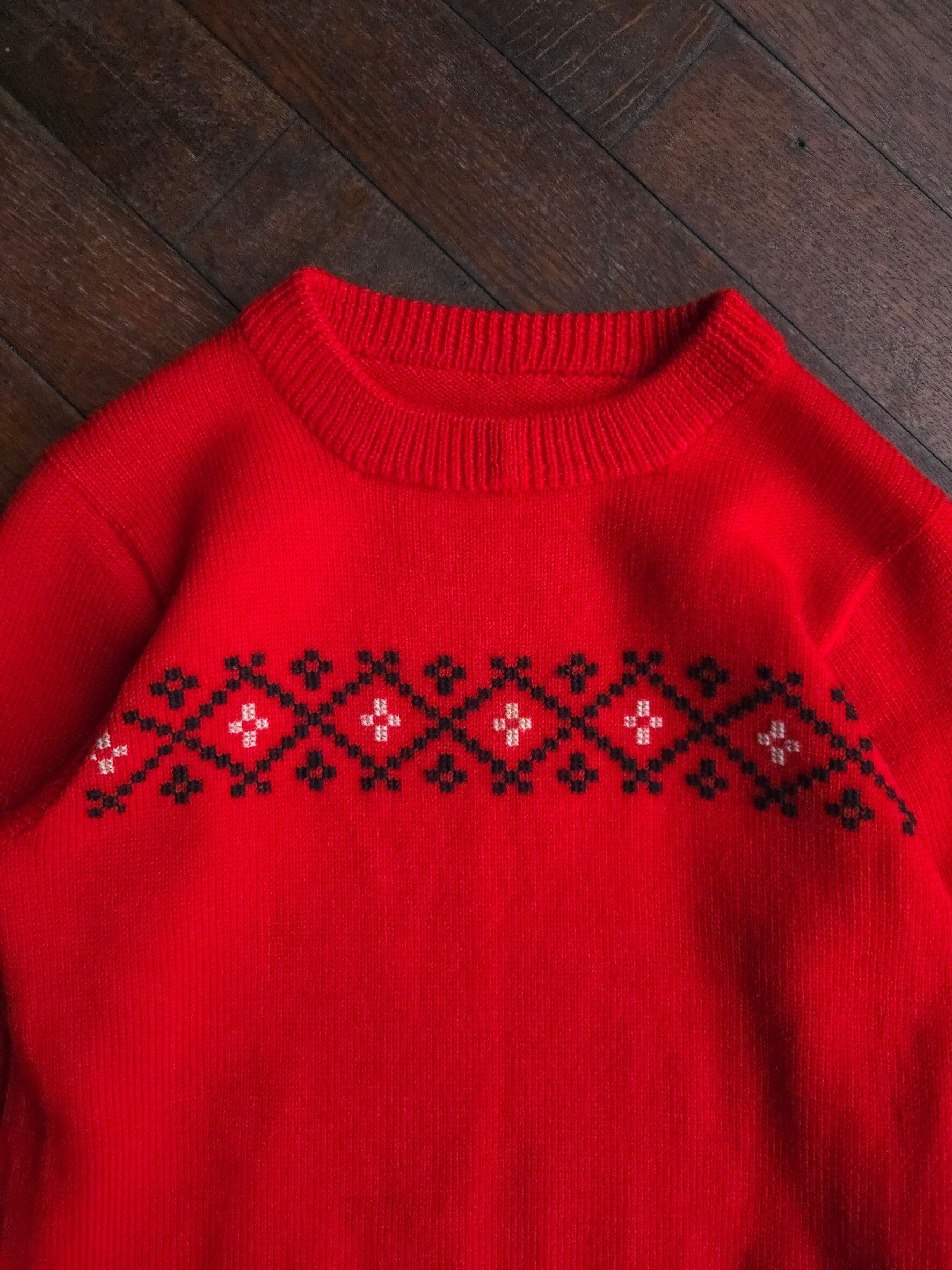 ☑︎ 柄・デザイン:胸元にノルディックパターンの入った鮮やかなニット、右下にポケット付